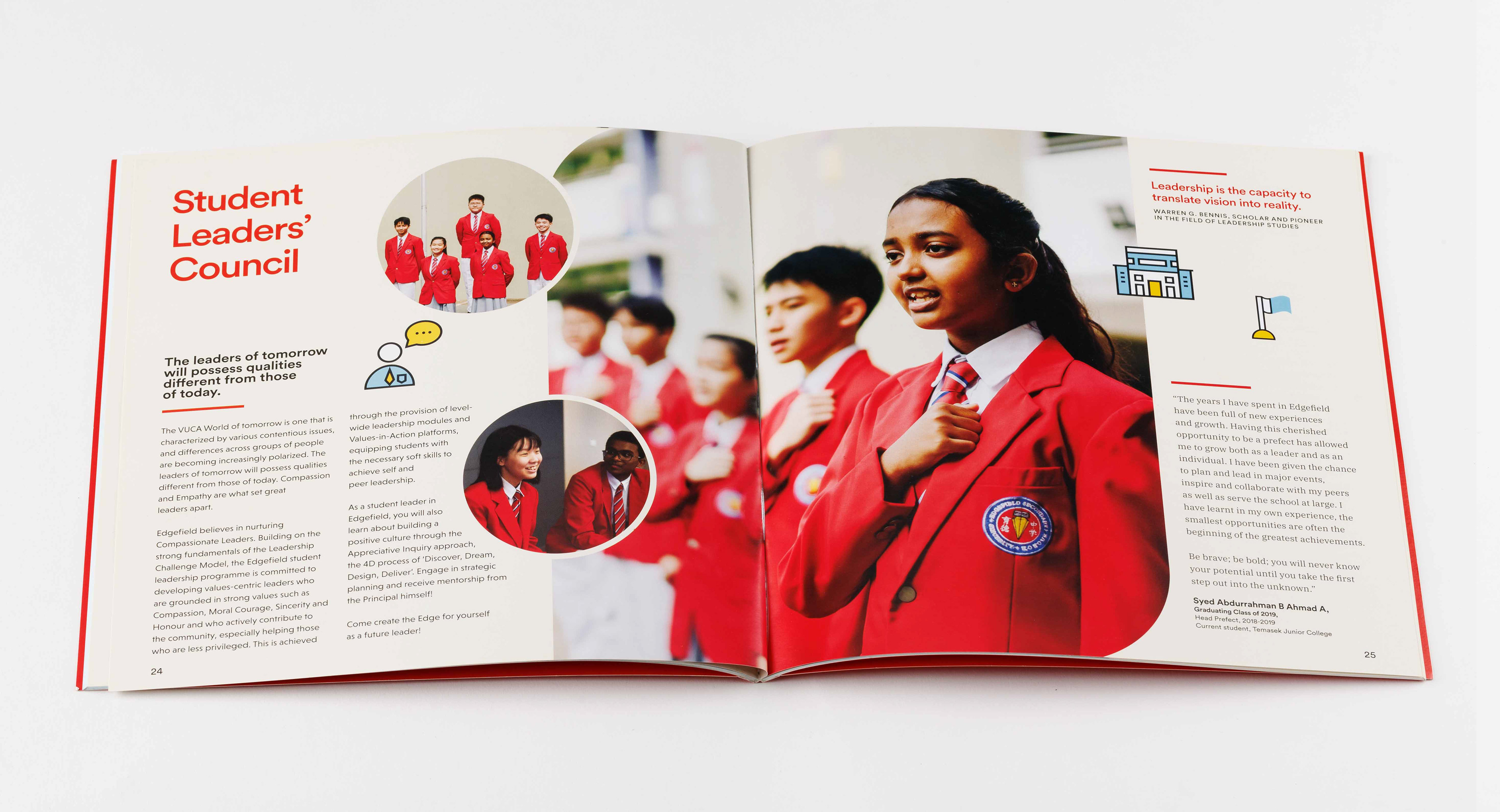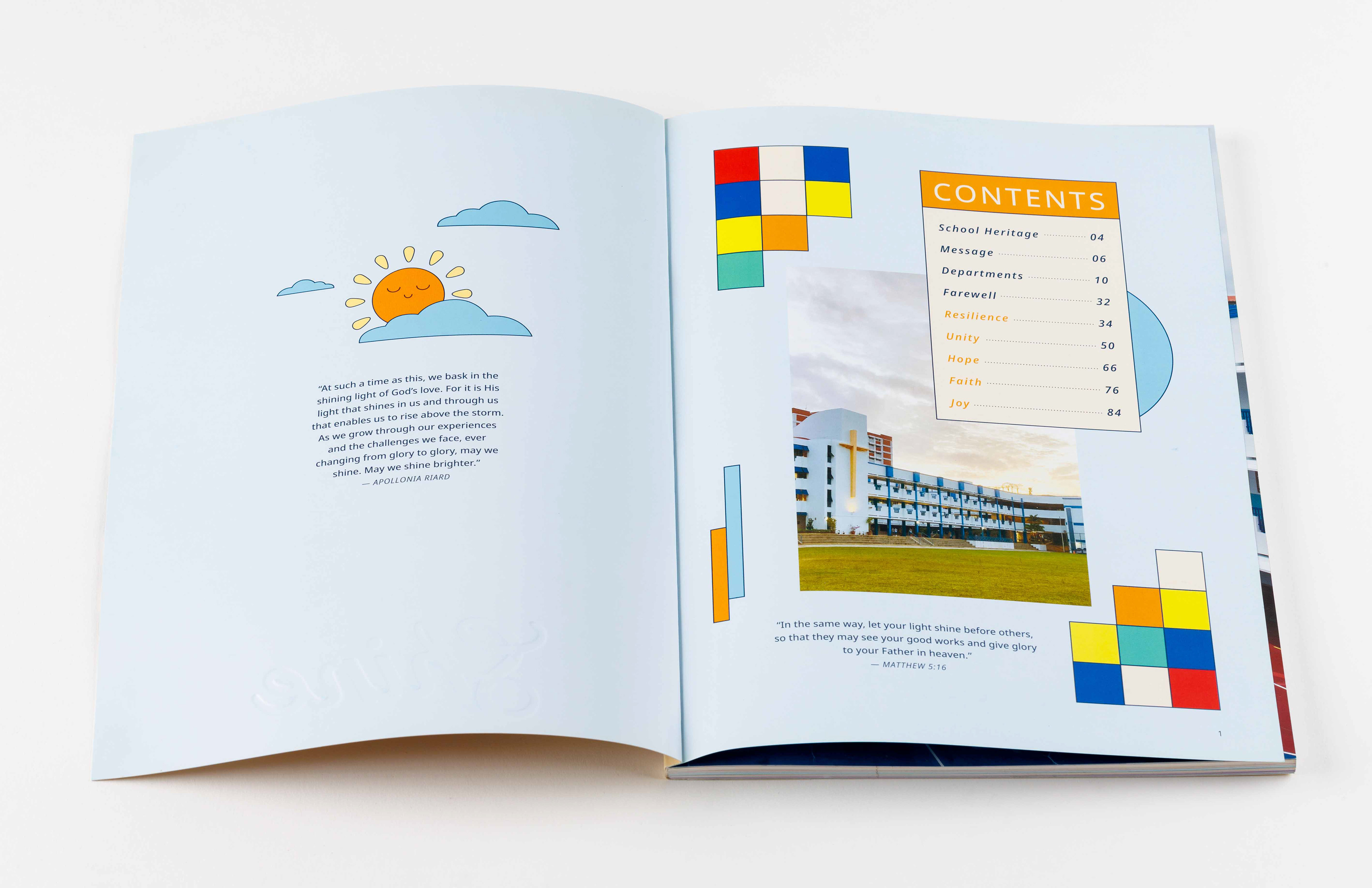 Publication Design • Print Design • Custom Illustration For these projects, I crafted editorial layout designs for the school yearbook of Holy Innocence High School and Edgefield Secondary School, incorporating the respective rich history and vibrant atmosphere of the school into the editorial content. The goal was to create a visually engaging publication that serves as a timeless keepsake for students while capturing the essence of the schools’ identity.